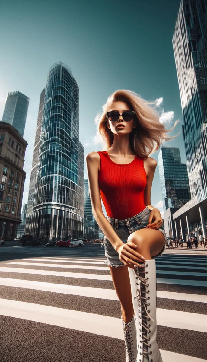 Городской портрет уверенности и стиля. Молодая женщина в ярком образе становится символом динамичной эпохи. Светлые волосы гармонично сочетаются с дерзкими солнечными очками, а красный топ без рукавов подчеркивает энергичность. Белые брюки и практичные ботинки добавляют образу функциональности и решительности. Поза на пешеходном переходе, руки, покоящиеся на коленях, создают впечатление спокойной силы и контроля над ситуацией. Высокие здания на заднем плане формируют футуристический городской пейзаж, а голубое небо символизирует безграничные возможности. Эта фотография – воплощение современного духа, сочетающее в себе уверенность, стиль и стремление к новому. Она передает атмосферу свободы и дерзости, вдохновляя на смелые решения и покорение вершин. Яркие цвета и четкая композиция создают запоминающийся визуальный образ, который привлекает внимание и оставляет глубокое впечатление. Это не просто фотография, это заявление, отражающее индивидуальность и неповторимость. Кажется, будто героиня этой фотографии готова к любым вызовам, которые бросает ей городская жизнь. Она – современная амазонка, уверенно шагающая навстречу своему будущему