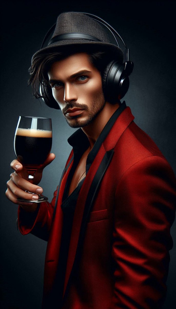 #2. профессиональная фотография мужчины с короткими темными волосами, в красной кожаной куртке, на голове черная шапка, наушники на ушах, серьёзное выражение лица, держащий в руке стакан тёмного пива, фон – темно-серый, настроение – загадочное и дерзкое #role_music