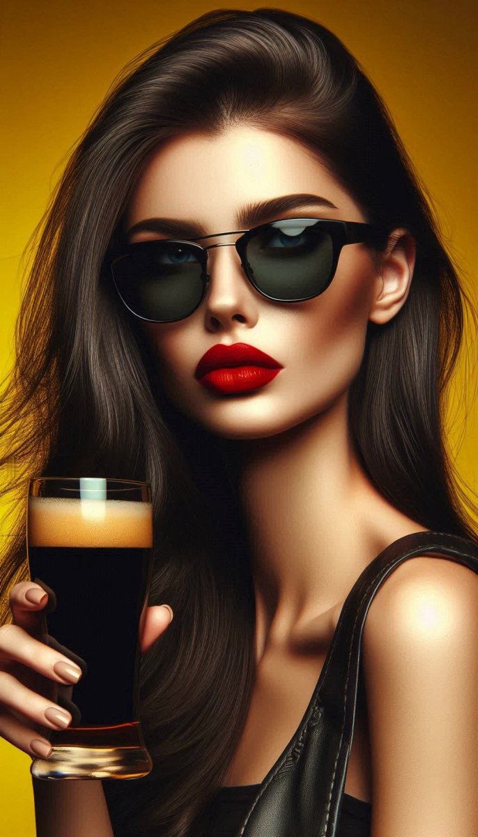 #1. a professional photo young woman with long dark hair and red lipstick, wearing black sunglasses, serious expression with slightly parted lips, holding glass of dark beer in right hand, BG is bright yellow, edgy style #role_music