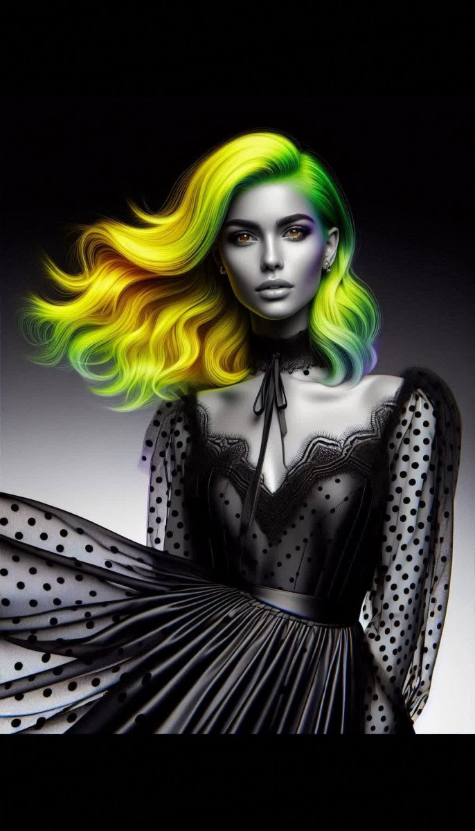 Яркая мода: женщина с неоново-желтыми волосами и гороховым платьем - Генерация в нейросети Dalle 3