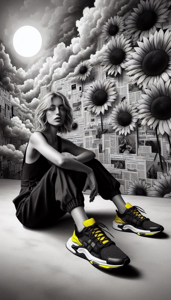 Монохромное цифровое искусство запечатлело задумчивый момент молодой женщины, сидящей на полу перед стеной, увешанной вырезками из газет. Её образ выделяется среди хаотичного фона благодаря контрастному сочетанию цветов и текстур. На ней полосатый комбинезон с чёткими чёрно-белыми линиями, а яркий жёлтый акцент на кроссовках привлекает внимание к деталям её обуви. Короткие светлые волосы обрамляют лицо, выражающее серьёзность и сосредоточенность, когда она смотрит в сторону. Задний план картины представляет собой облачное небо с пушистыми белыми облаками, создавая ощущение воздушности и лёгкости. Необычные структуры, напоминающие подсолнухи, парят над ней, добавляя сюрреалистический элемент в композицию и придавая ей загадочность. Вся сцена пронизана атмосферой меланхолии и размышлений, а использование чёрно-белой гаммы с редкими всплесками жёлтого цвета усиливает эмоциональное воздействие на зрителя. Картина словно приглашает задуматься о связи прошлого и настоящего, о влиянии информации и о поиске смысла в окружающем мире. Это не просто изображение, а скорее визуальная поэма, наполненная символизмом и глубоким смыслом, способная вызвать широкий спектр чувств и переживаний у каждого наблюдателя. Жёлтый акцент, выделяющийся на фоне монохромной палитры, может символизировать надежду или проблеск света в тёмных временах