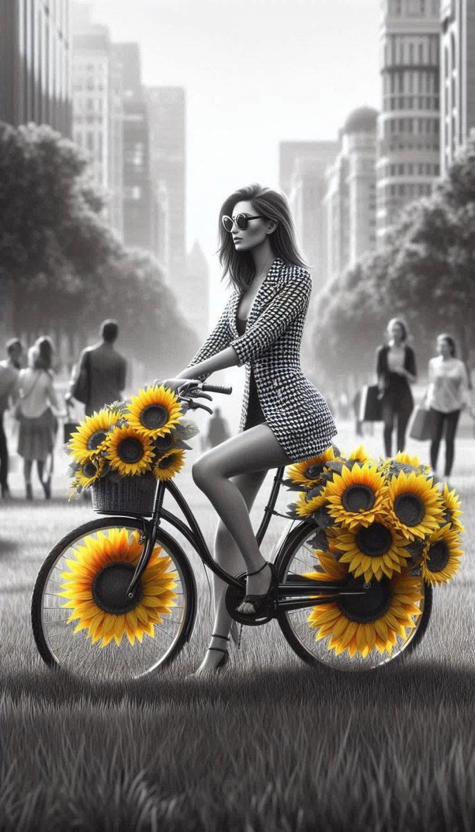 Завораживающая черно-белая цифровая иллюстрация, где загадочная женщина на ярком желтом велосипеде мчится по зеленому полю. Велосипед украшен огромными подсолнухами, закрепленными на переднем колесе, создавая неожиданный акцент цвета в монохромной палитре. На ней стильный черно-белый клетчатый блейзер и солнцезащитные очки, добавляющие образу элегантности и загадочности. Размытое заднее изображение оживленной улицы с пешеходами подчеркивает динамику момента и создает ощущение движения. Контраст между спокойствием поля и суетой городской жизни добавляет глубины и смысла в эту визуальную историю. Яркий желтый цвет велосипеда и подсолнухов служит мощным фокусным элементом, притягивающим взгляд и оживляя черно-белую композицию. Это произведение искусства – воплощение стиля, движения и неожиданных цветовых решений, вызывающее чувство свободы и радости от простых вещей. Идеальное сочетание классической монохромной эстетики и яркого акцента цвета делает эту картину неповторимой и запоминающейся. Кажется, что она запечатлела мгновение счастья и беззаботности, приглашая зрителя присоединиться к этому увлекательному путешествию