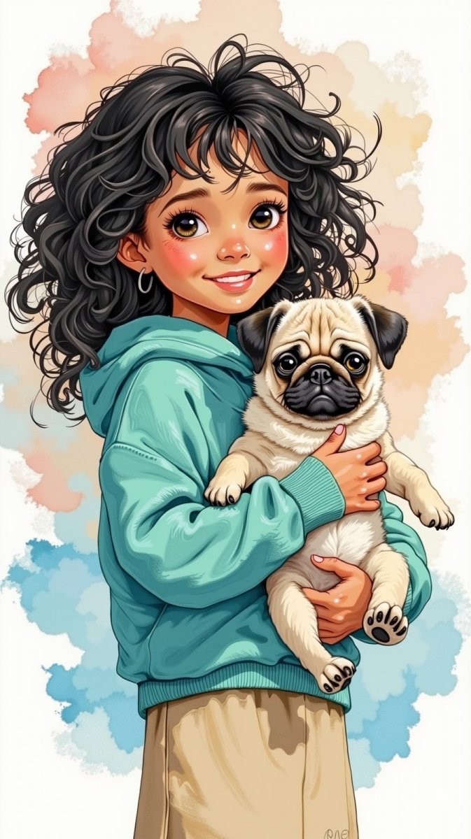 #1. ink drawing of young girl with curly black hair wearing a vibrant turquoise sweater and beige skirt, holding a small pug dog with sad eyes in her arms, cheerful expression, background is dreamy pastel colors, bg is white #role_darling