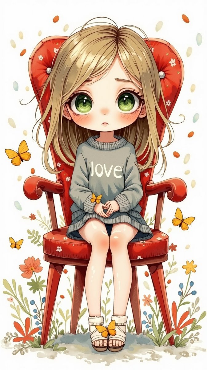 Нежная иллюстрация, наполненная меланхолией и детской непосредственностью. В центре композиции – юная девушка с большими, выразительными зелеными глазами, словно отражающими внутренний мир. Она удобно расположилась на ярко-красном стуле, создавая контрастный акцент на белом фоне. Девушка одета в уютный серый свитер, украшенный надписью 'love', что добавляет образу нотку наивной романтики и надежды. Её ноги скрещены, поза выдает задумчивость и легкую грусть. В руках она нежно держит бабочку – символ хрупкости, красоты и перемен. Общая атмосфера рисунка пронизана легкостью и воздушностью, характерными для мультяшного стиля, но в то же время трогает своей искренностью и глубиной эмоций. Эта работа запечатлела момент умиротворения и созерцания, приглашая зрителя почувствовать настроение юной героини и задуматься о простых радостях жизни. Кажется, будто она погружена в свои мысли, наблюдая за миром с невинным и немного грустным взглядом. Это произведение искусства вызывает теплые чувства и ощущение внутренней гармонии, несмотря на легкую нотку печали