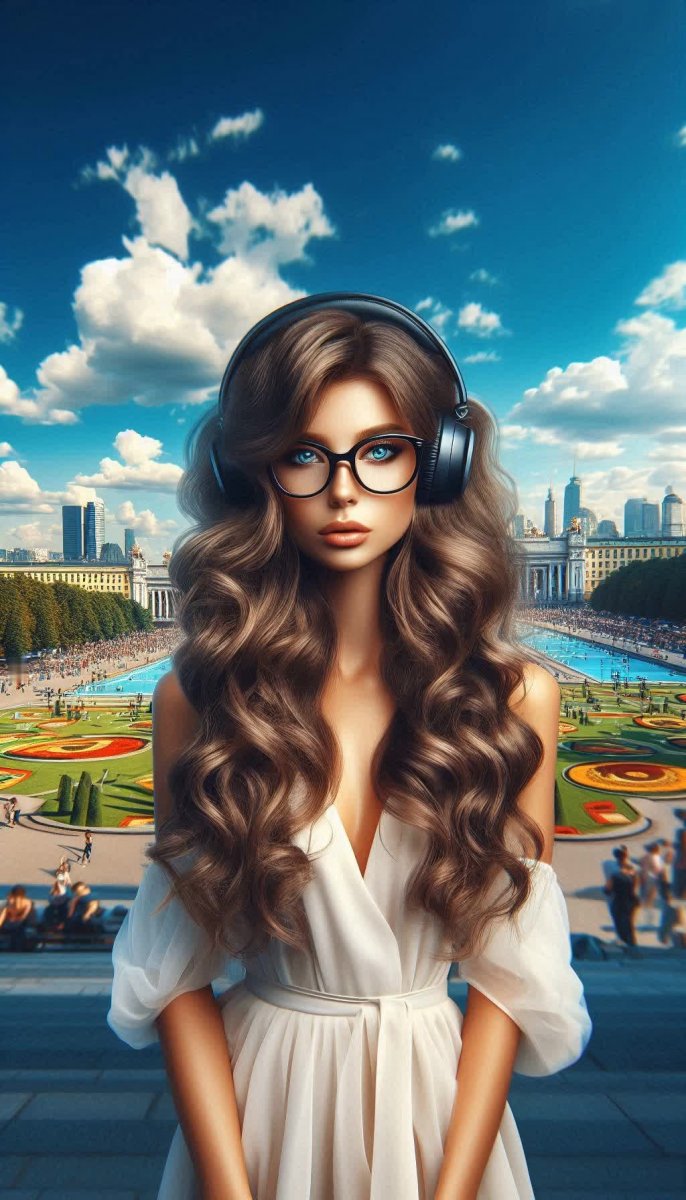 Загадочная современница, воплощение непринужденной элегантности и музыкальной свободы. В объективе камеры запечатлена молодая женщина с роскошными кудрями, ниспадающими волнами на плечи, облаченная в струящееся белое платье, подчеркивающее ее грациозную фигуру. Ее образ завершают стильные очки увеличенного размера и современные наушники, символизирующие погружение в мир мелодий и ритмов. Девушка уверенно стоит в самом сердце оживленного городского парка, окруженная зеленью деревьев и ухоженными газонами. На заднем плане раскинулся панорамный вид на городскую застройку, а над всем этим великолепием простирается бескрайнее ярко-синее небо, наполненное солнечным светом. Вся композиция пронизана атмосферой легкости и моды, создавая ощущение мгновения уюта и вдохновения. Выражение лица девушки загадочно и притягательно, словно она скрывает в себе множество историй и тайн. Это портрет современной женщины, сочетающей в себе нежность, силу и индивидуальность, живущей в гармонии с собой и окружающим миром. Кажется, что сейчас из наушников зазвучит любимая мелодия, а сама героиня отправится навстречу новым приключениям, оставив после себя шлейф вдохновения и позитива. Фотография излучает оптимизм и энергию, приглашая зрителя окунуться в атмосферу беззаботности и стиля