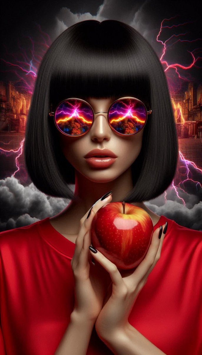 #1. профессиональная фото молодой женщины с короткими черными волосами в стиле боб с челкой, одетой в красную футболку, держащей красный яблоко перед лицом, серьёзное выражение лица, большие круглые солнцезащитные очки с розовой и жёлтой молнией на линзах, золотая оправа, на фоне тёмно-серого неба, общий стиль - футуристичный и дерзкий. #role_music