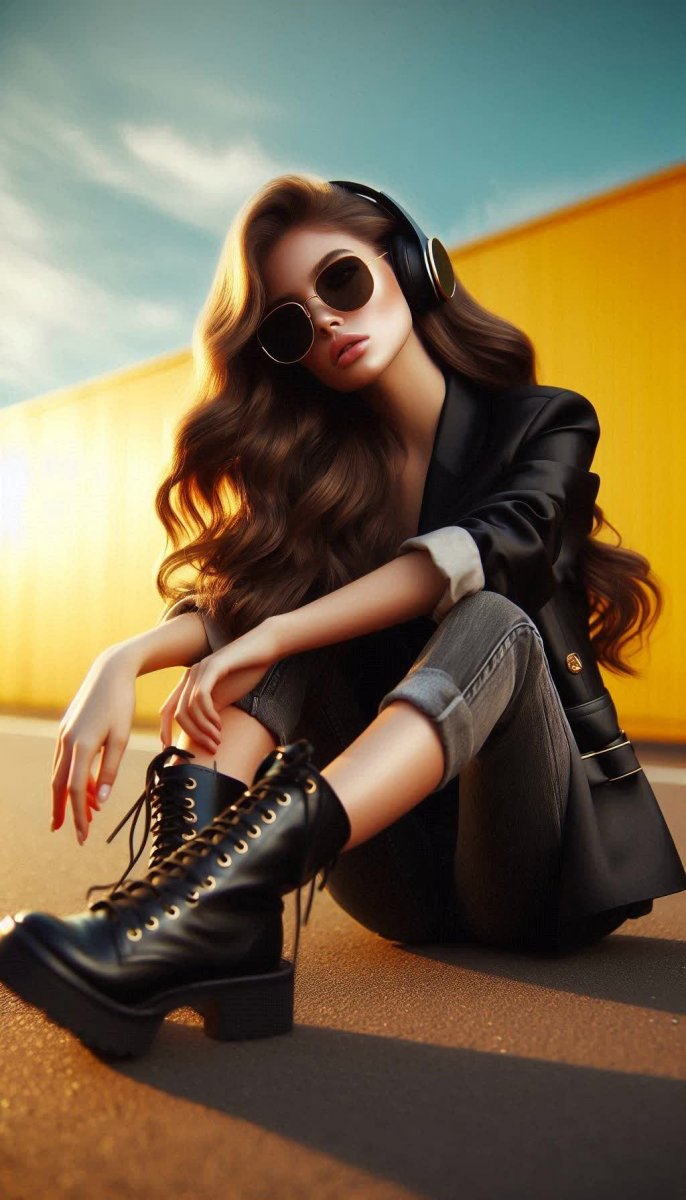 #3. профессиональная фотография молодой женщины с золотыми солнцезащитными очками и черной кожаной курткой, сидящей на земле со скрещенными ногами в чёрных ботинках, длинные волнистые волосы, наушники на голове, задумчивый взгляд, фон – яркое жёлтое небо, стиль – мультяшный, настроение — прохладное и дерзкое. #role_music