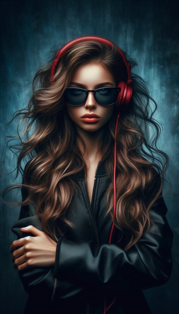 #4. профессиональная фотография молодой женщины с распущенными каштановыми волосами и солнцезащитными очками, чёрный кожаный жакет, красные наушники на голове, серьёзное выражение лица, руки на коленях, фон - синий с текстурой, настроение – темное и таинственное #role_music