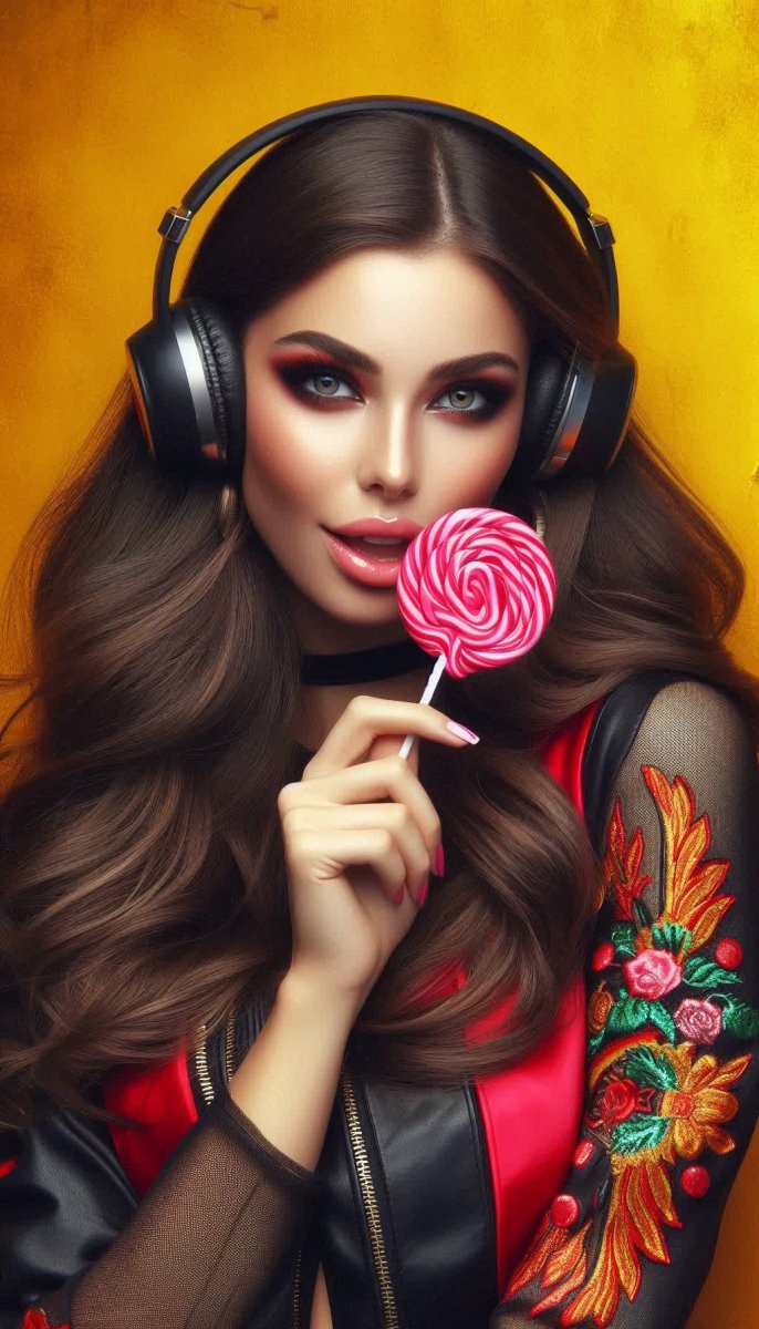 #4. профессиональное фото молодой женщины с длинными каштановыми волосами, одетой в черный топ с красным дизайном и большими наушниками, держащей розовый леденец и смотрящей в камеру, фон - ярко-желтый с текстурой, стиль мультяшный, настроение игривое и edgy. #role_music