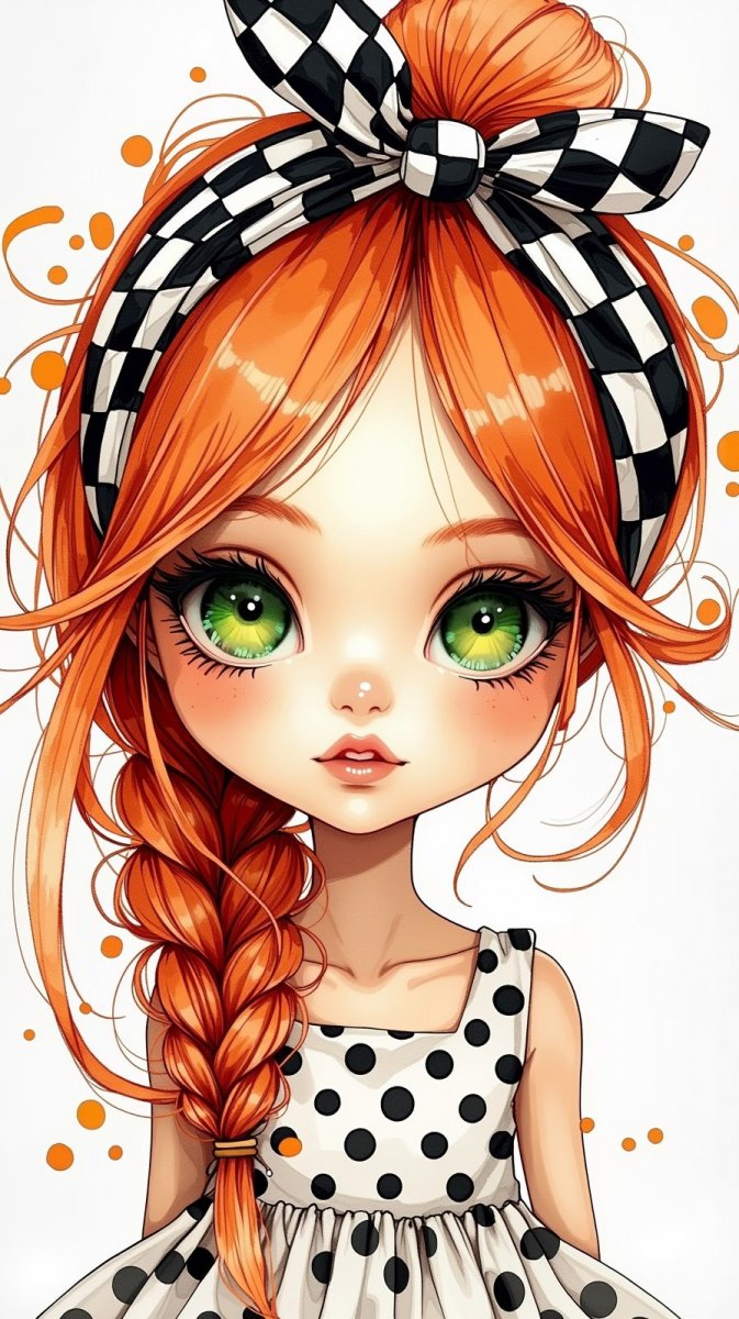 #5. zentangle, close-up portrait of doll with red hair and green eyes, black and white checkered headband, wearing polka dot dress, bg is white #role_darling