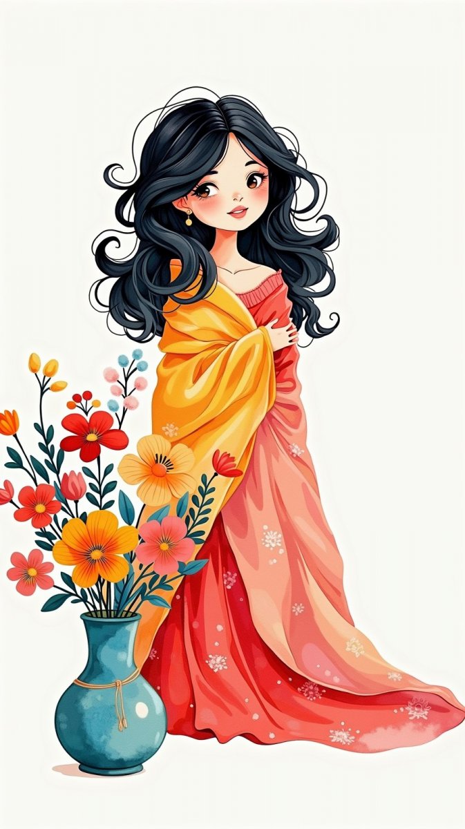 #4. paper cut gouache illustration of a doll with dark hair styled in curls, draped in a cozy blanket with a whimsical smile, next to a vase of colorful flowers, bg is white #role_darling