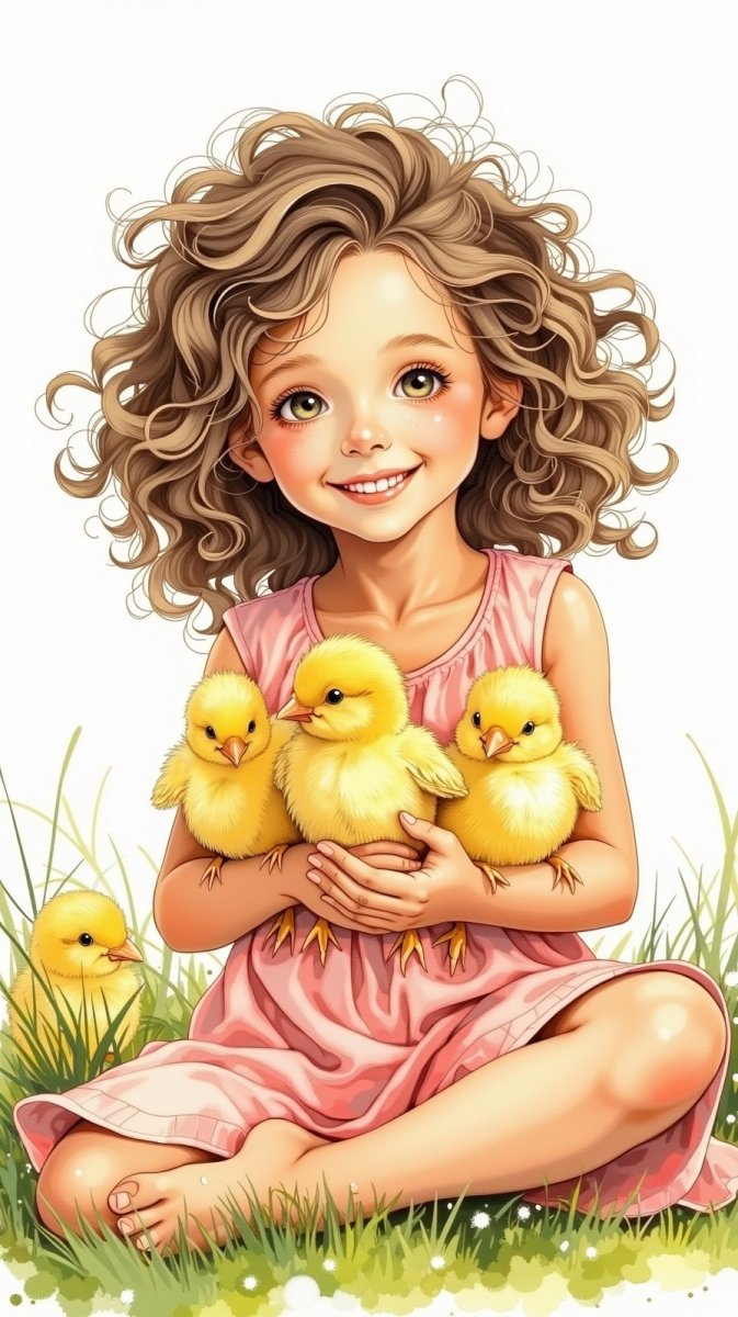 #1. ink drawing of young girl with curly hair, holding yellow chicks in her arms, wearing a pink dress, big smile on her face, sitting on grassy field, bg is white #role_darling