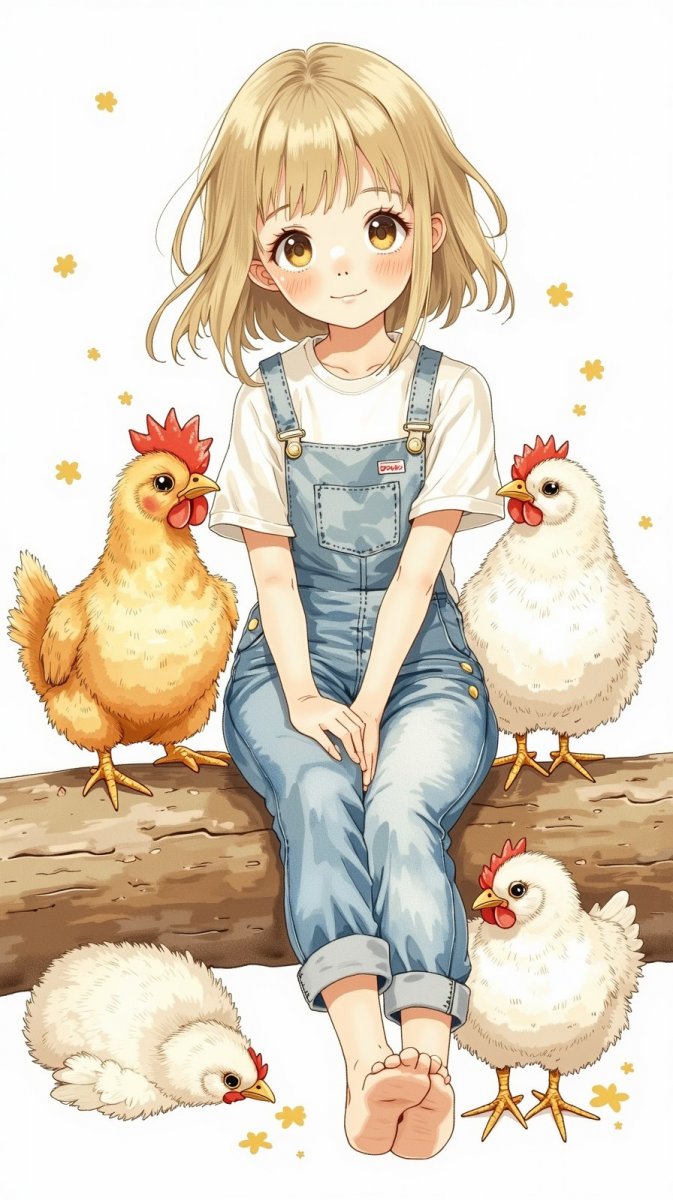 #2. illustration of girl with short hair, surrounded by fluffy chickens, wearing blue overalls and white t-shirt, playful expression, sitting on wooden log, bg is white #role_darling