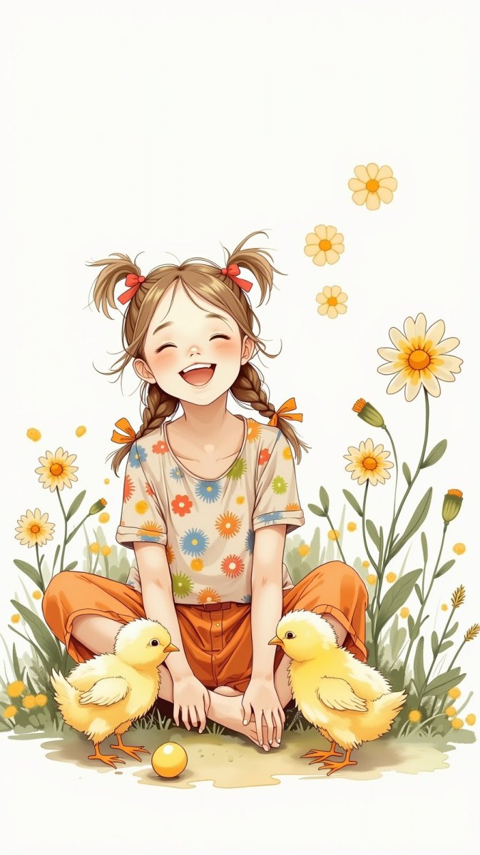 Беззаботная сцена из детства, наполненная радостью и нежностью. На переднем плане изображена очаровательная девочка с косичками, увлеченно играющая с пушистыми цыплятами. Ее яркий наряд подчеркивает безмятежность момента, а залихватный смех создает атмосферу искренней восторга. Девочка уютно расположилась на земле, окруженная пестрым ковром из цветов, создавая ощущение сказочного сада. Фон выполнен в белых тонах, что акцентирует внимание на центральном сюжете и придает изображению легкость и воздушность. Картина излучает тепло и позитив, передавая безграничную любовь к миру и простым радостям жизни. Это настоящий гимн детству, воплощенный в ярких красках и милых деталях. Она вызывает чувство умиления и ностальгии по светлым дням из прошлого, напоминая о важности простых вещей и умении радоваться каждому мгновению. Идеально подойдет для иллюстрации добрых историй и сказок, передавая атмосферу счастья и беззаботности