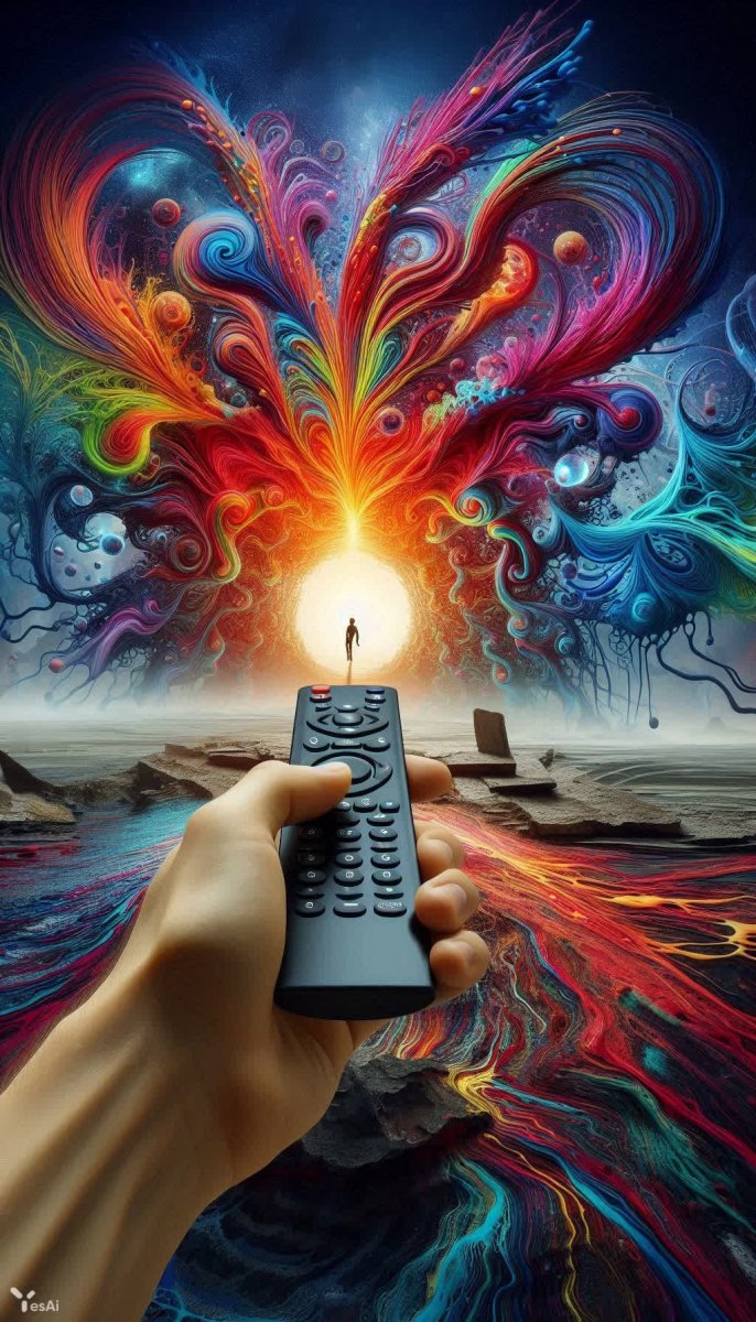 First person view. A human hand holds the TV remote control in the forward direction, a portal to another world directly opens, connecting this world with a world from another universe, very colorful, drip painting with elements of capillary pens, cgi, art, 16k