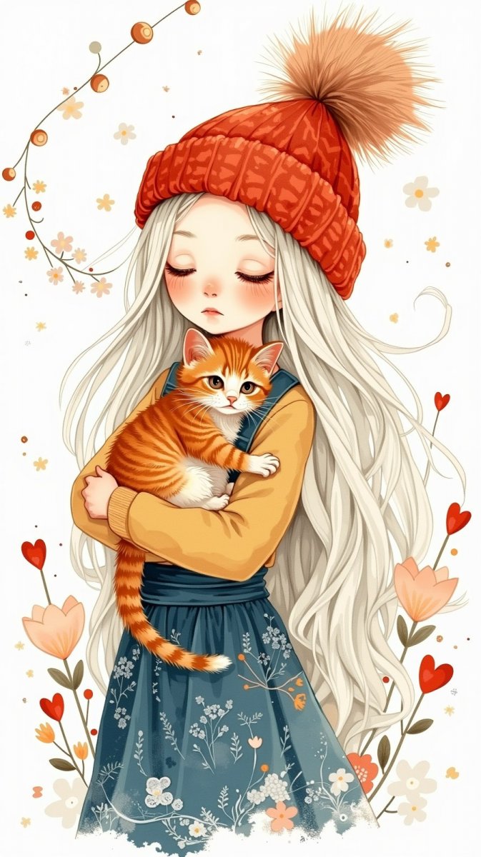#5. folk art illustration of girl with long white hair in a red beanie, cradling a small orange kitten in her arms, dreamy expression, bg is white #role_darling