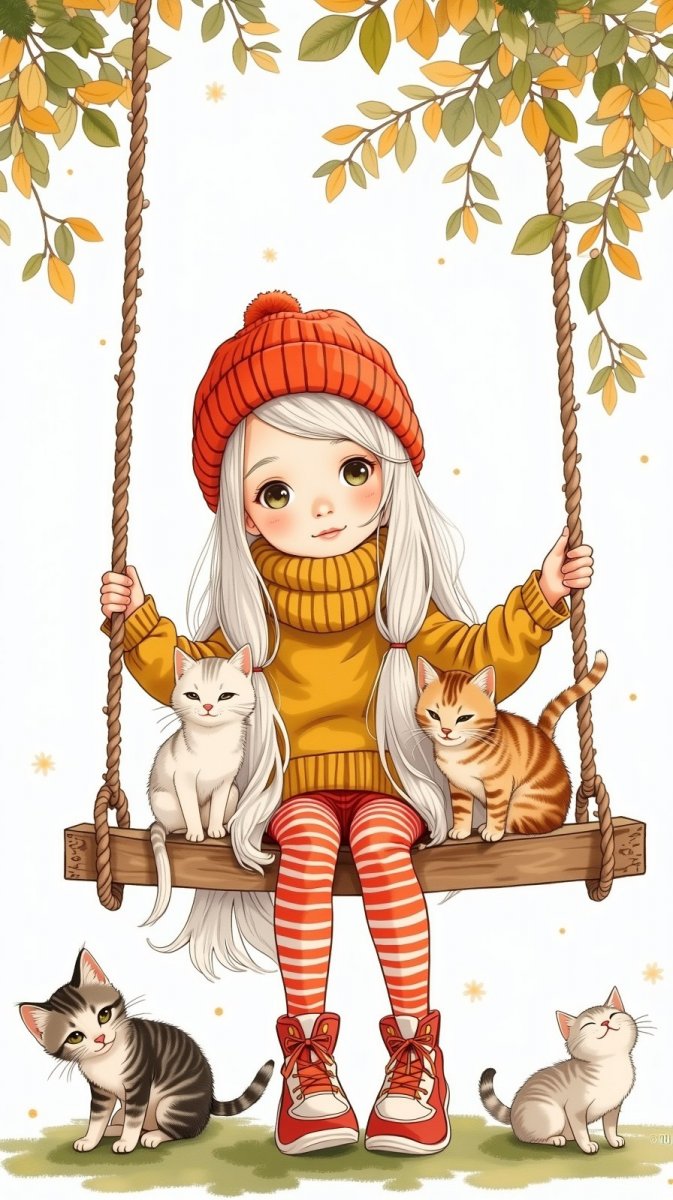 #3. doodling of young girl with long white hair framed with a red beanie, sitting on wooden swing, surrounded by playful kittens, whimsical mood, bg is white #role_darling