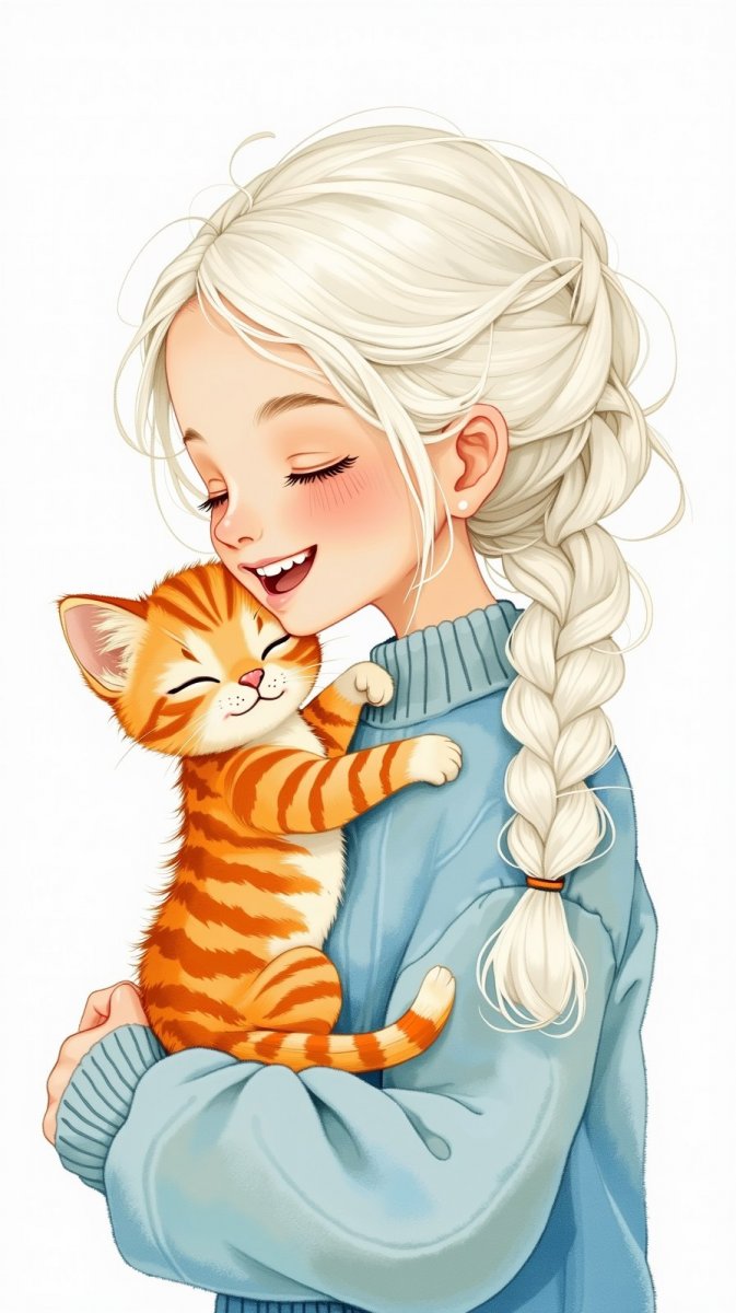 #2. cartoonish illustration of girl with white hair styled in braids, light blue sweater, holding tiny orange kitten close to her cheek, joyful smile, bg is white #role_darling