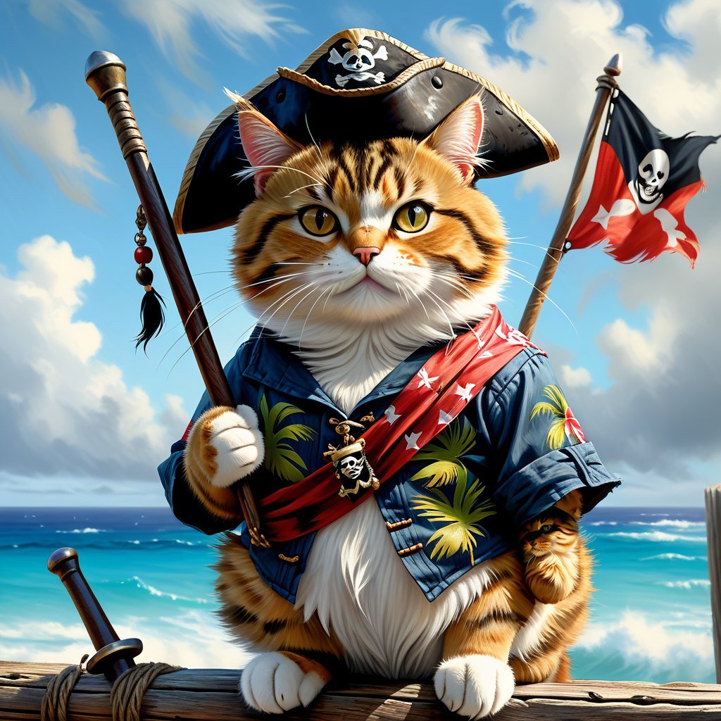Photorealistic oilpainting style, darkfantasy mood: a brutish, overweight anthropomorphic cat wearing a flat cap and a faded Hawaiian shirt, evoking a whimsical pirate character holding a tattered pirate flag on a weathered wooden pole. Emphasize expressive features: thick fur, a scarred ear, stout body and callused paws. Rich tactile textures detailed fur, fabric weave, weathered wood and frayed flag, visible brushstrokes and subtle impasto for painterly depth. Background: open sea with a distant tropical island under a moody dramatic sky, rough desaturated colors, minimal retouching. Directional warm rim light, deep shadows, slight shallow ...