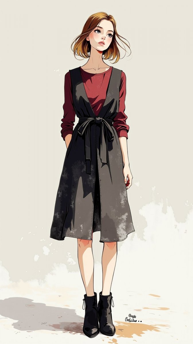 ink drawing, young woman standing in studio, plain gray background, wearing black sleeveless vest over a maroon long-sleeved top with round neckline, cinched at waist with belt, also wearing black ankle boots, looking off to side. #role_moda