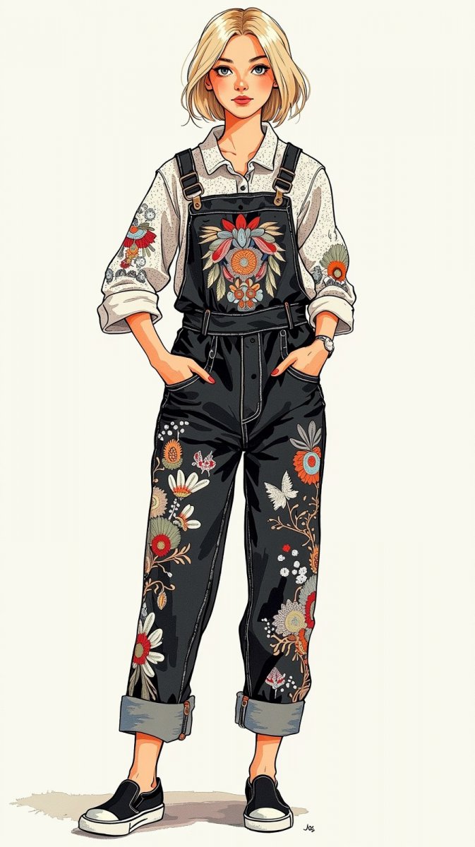 zentangle, young woman posing, wearing a black pinafore top with white collared shirt underneath, lightweight fabric, relaxed fit, black slip-on sneakers, short blonde hair styled in sleek bob, one hand on hip. #role_moda