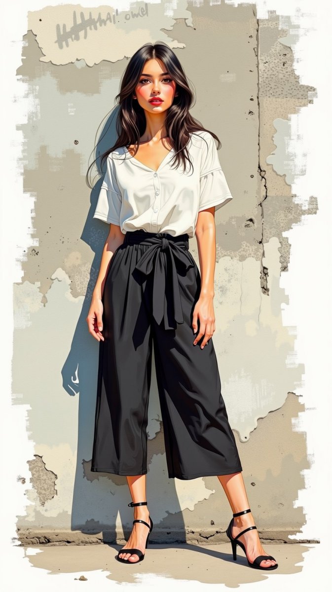 Молодая женщина уверенно позирует перед однотонным белым фоном, создавая минималистичный и стильный образ. Её взгляд, направленный прямо в камеру, излучает спокойную силу и самодостаточность. На ней – элегантные черные кюлоты с высокой талией, подчеркивающие фигуру, а изящный пояс добавляет акцент на талии. Яркая красная помада придает образу завершенность и нотку дерзости, контрастируя с темным цветом волос, ниспадающих длинной волной. Фон нейтрального белого цвета позволяет полностью сосредоточиться на модели и её одежде, выделяя детали кроя и фактуру ткани. Этот образ идеально подходит для демонстрации модных тенденций и подчеркивает индивидуальность современной женщины, сочетающей в себе элегантность, комфорт и уверенность в себе. Композиция фотографии выстроена таким образом, чтобы максимально раскрыть эстетику уличной моды, сохраняя при этом изысканность и лаконичность. Образ демонстрирует актуальный стиль, где простота форм сочетается с яркими акцентами, создавая неповторимый визуальный эффект. Этот наряд подчеркивает современный взгляд на классический крой и является отличным примером того, как можно выглядеть стильно и непринужденно в любой ситуации. Использование белого фона позволяет избежать отвлекающих факторов и полностью погрузиться в атмосферу моды и стиля