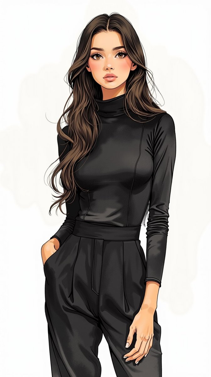 ink drawing, young woman standing in studio, plain white background, wearing black long-sleeved top with high neckline, black trousers, simple design, looking directly at camera, long dark hair styled in loose waves. #role_moda