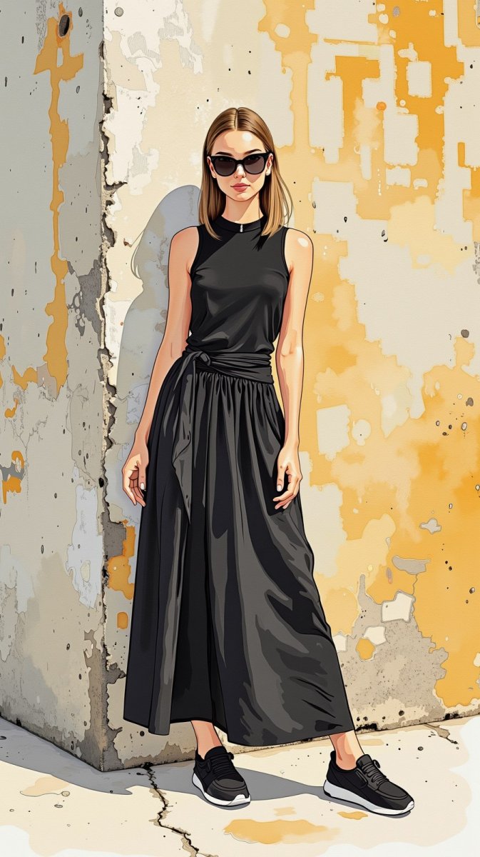 naive art, young woman standing in front of concrete wall, wearing black sleeveless top with high neckline, long flowing skirt, paired with black slip-on sneakers, sunglasses on her face, hair styled in sleek straight look, minimalistic and modern aesthetic. #role_moda