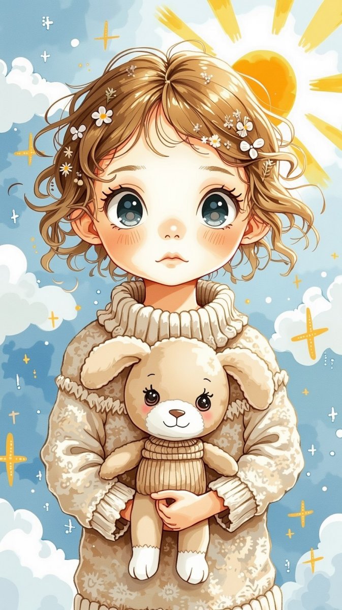 cute watercolor illustration of a little girl with curly hair wearing a cozy knitted sweater, holding a plush doll, set against a dreamy light blue background with fluffy clouds and warm sun rays, adding a whimsical touch with tiny sparkling stars.