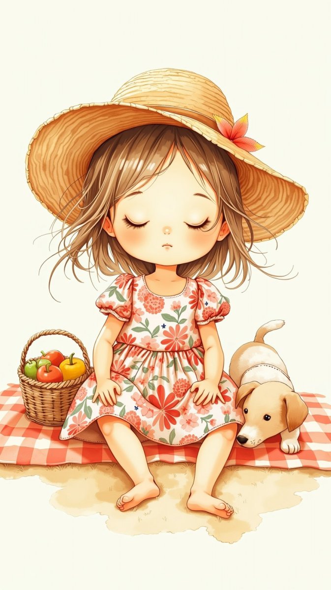 2. cute watercolor drawing of a charming doll with a round face, dressed in a vibrant floral dress and a matching sun hat, enjoying a picnic on a light background, with a basket of fruits and a playful puppy nearby, embodying innocence and joy.