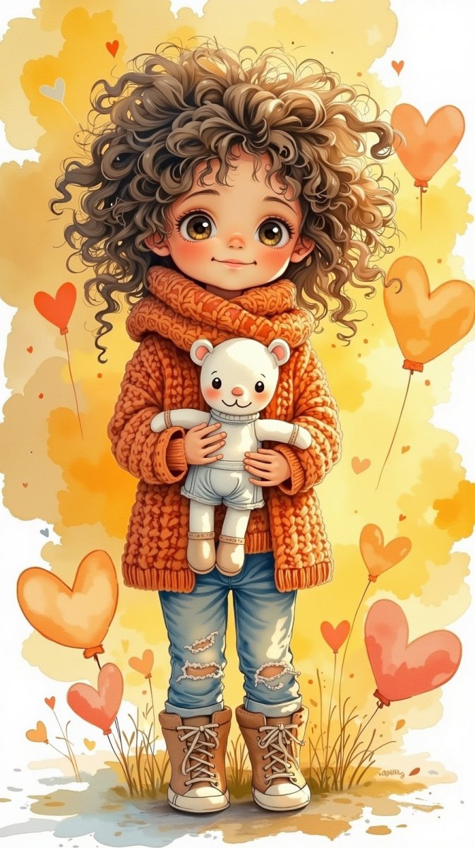 5. enchanting watercolor depiction of a young girl with curly hair, wearing a cozy knitted sweater and holding a handmade doll, standing against a bright background with playful hearts and subtle textures, radiating warmth and childhood bliss.