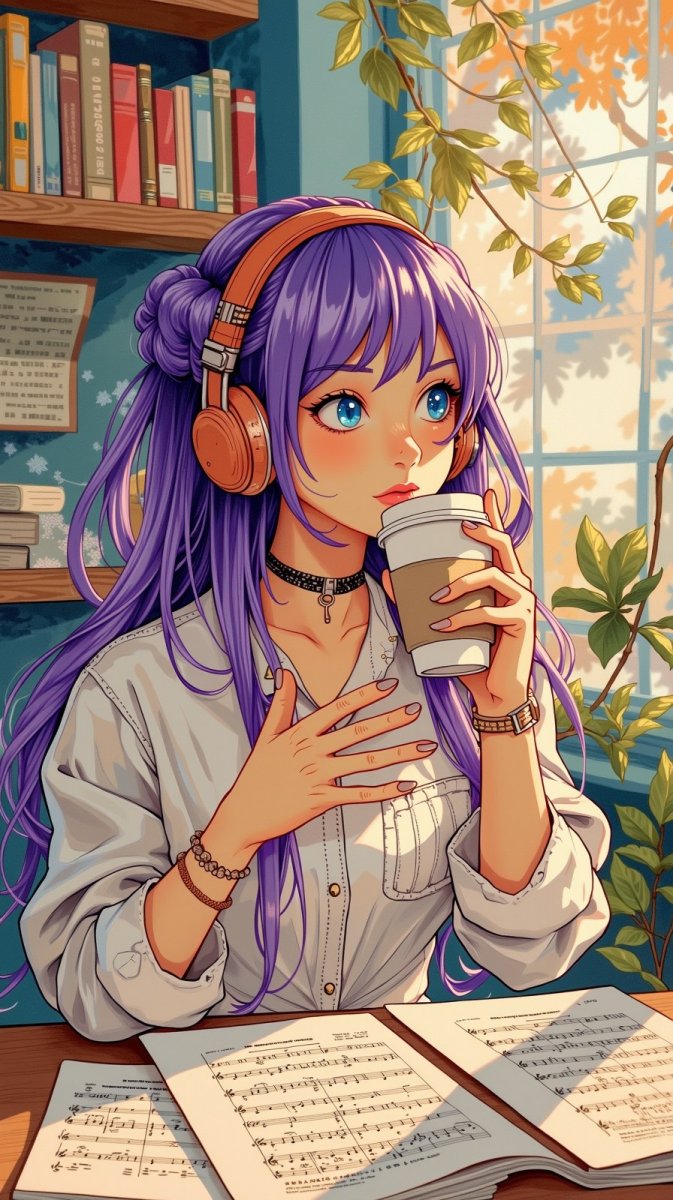 4. Stylish young woman with purple hair, wearing oversized headphones, sipping coffee from a takeaway cup, surrounded by books and musical sheets at a café, quirky expression as if deeply engaged in a thought, BG is a cozy and vibrant café interior.