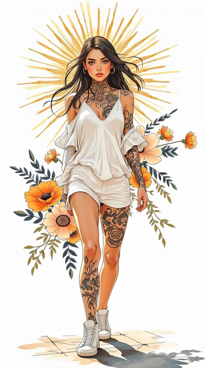 #2 full-length portrait of a woman wearing white sneakers and a flowing white top, surrounded by radiant floral tattoos in sterling silver, set against a stark backdrop, showcasing high precision details and contrasting light.