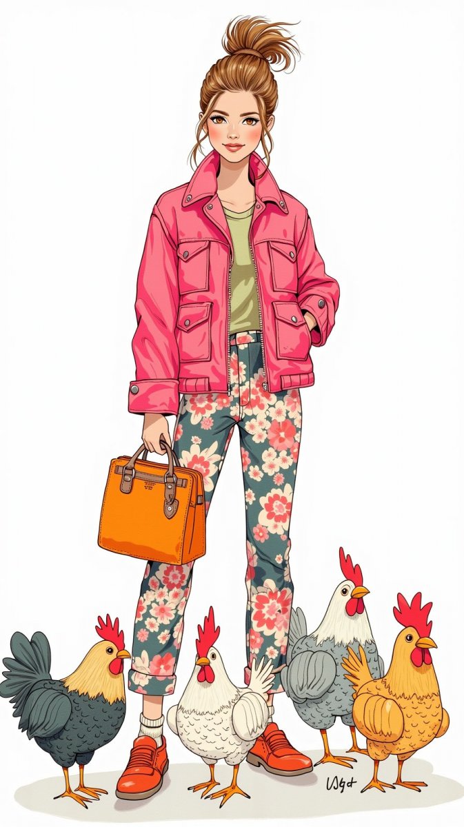 #1. ink drawing of doll wearing bright stylish outfit, pink jacket, floral print trousers, holding orange bag, surrounded by knitted chicken figurines, bg is white #role_chicken
