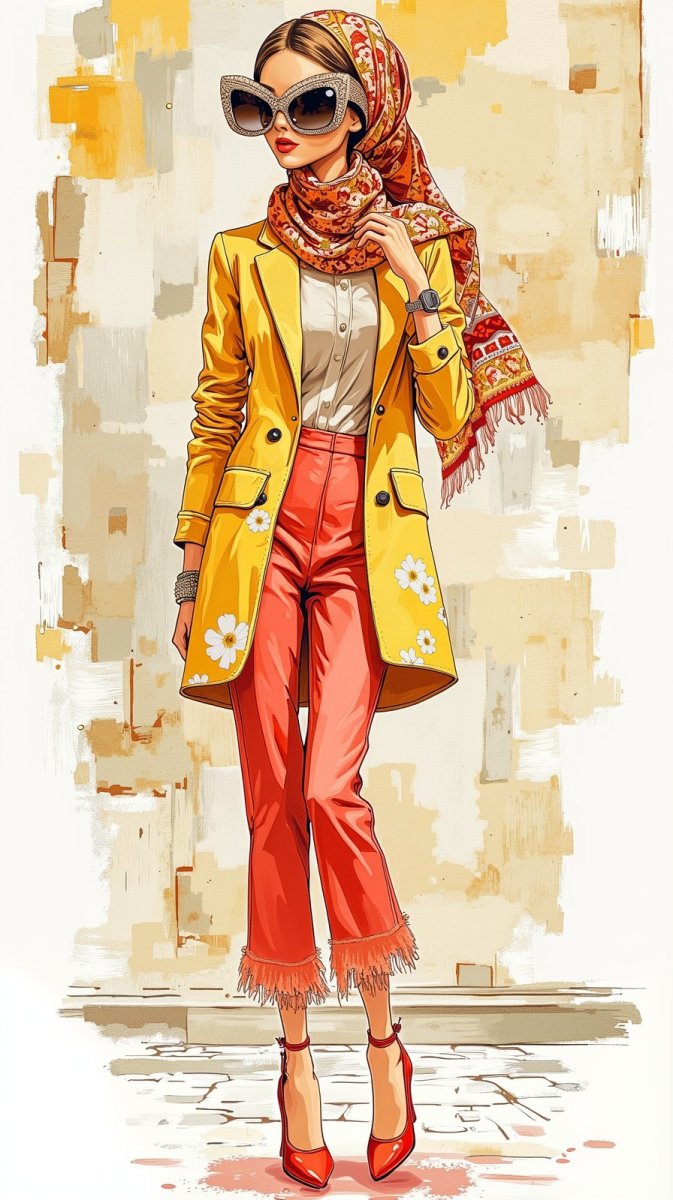 Нежная наивная картина изображает куклу в ярком и стильном наряде. Её украшает цветочный платок, а глаза скрыты за большими цветочными солнцезащитными очками. Кукла уверенно стоит на высоких красных каблуках, создавая ощущение легкости, изысканного стиля и весеннего настроения. Фон представляет собой стену с абстрактным рисунком, выполненную в белых тонах, что подчеркивает яркость и выразительность образа куклы. Эта работа передаёт атмосферу беззаботности и игривости, характерные для наивного искусства, где простота форм сочетается с насыщенными цветами и оригинальным взглядом на мир. Вся композиция пронизана ощущением радости и оптимизма, словно приглашая зрителя окунуться в сказочный мир воображения и творчества. Детализированная проработка костюма куклы и тщательно подобранный фон создают гармоничное сочетание, которое радует глаз и дарит положительные эмоции. В целом это произведение является прекрасным примером наивного искусства, способным вызвать улыбку и подарить хорошее настроение каждому зрителю. Это яркое визуальное воплощение весенней свежести и беззаботной красоты