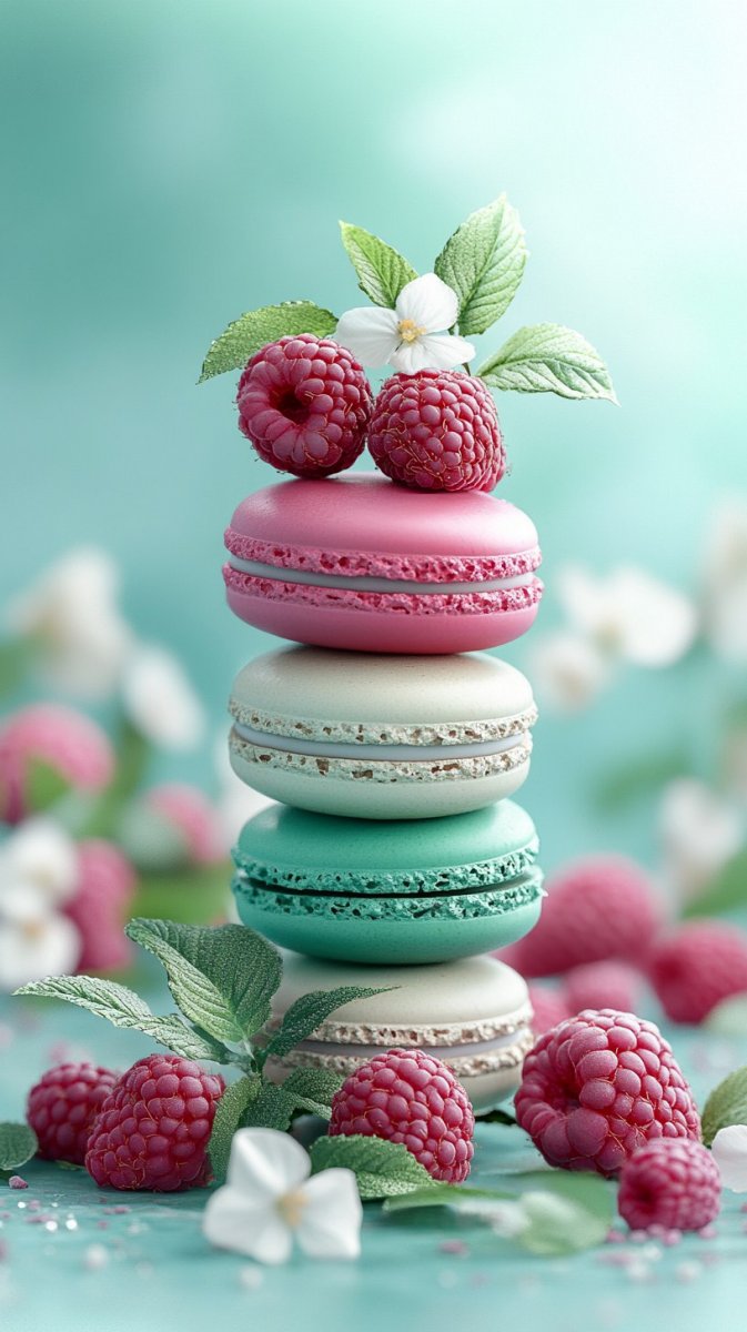 hyper realistic, raspberries and macarons stacked on top of each other, creating a visually appealing composition, mint leaves, delicious textures, assorted various flavors, shapes, and sizes of popsicles, hdr, mobile wallpaper.