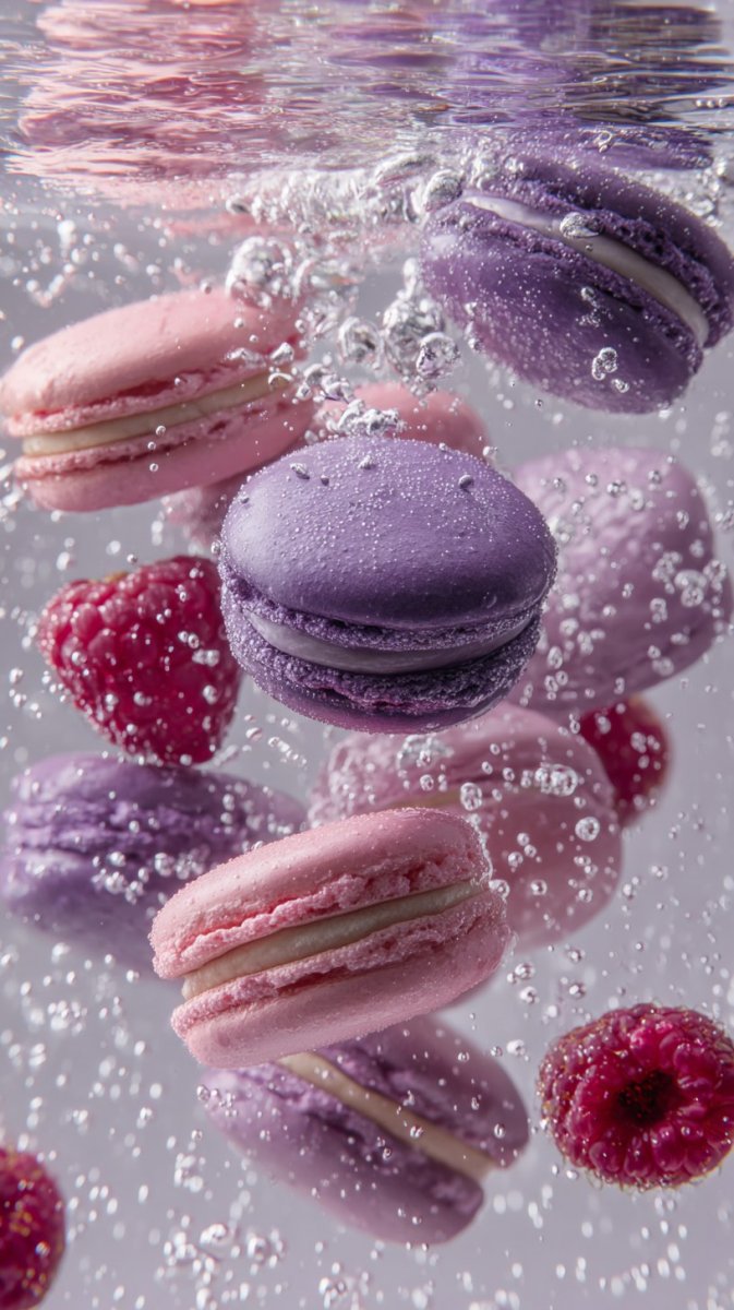 hyper realistic, macarons and sweets in various shapes, white BG, studio lighting, raspberries falling into the water, creating an atmosphere of freshness, purple macarons, delicious, pink glittery strawberry-shaped wallpaper, HQ.