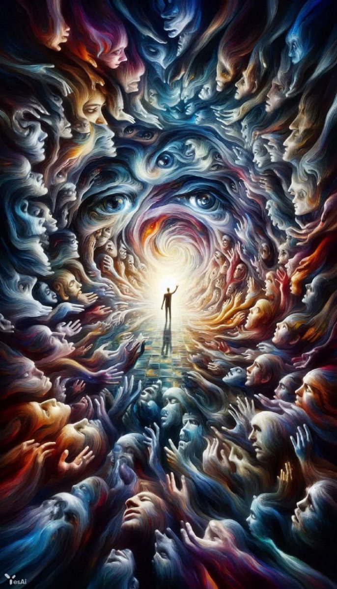 На изображении, созданным нейросетью Dalle 3 в стиле, напоминающем творчество Альфонса Мухи, представлен сложный мир отражений и искаженных лиц. Это визуальное воплощение отчаяния и надежды, где множество лиц сливаются в динамичный вихрь, размывая границы между зрителем и наблюдаемым. В центре этого хаоса – одинокая фигура, отчаянно пытающаяся пробиться сквозь толпу, ощущая одновременно пристальный взгляд и полную невидимость.
