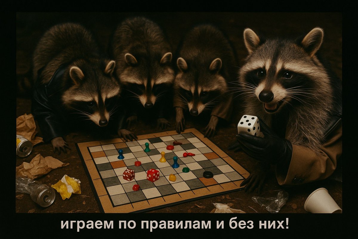photo on film, black frame, text in white letters on the black frame: "Играем по правилам и без них!", a group of raccoons thoughtfully staring at a game board with pieces scattered everywhere, one of them holding a dice with a mischievous grin. Trash scattered around them adds to the fun chaos.