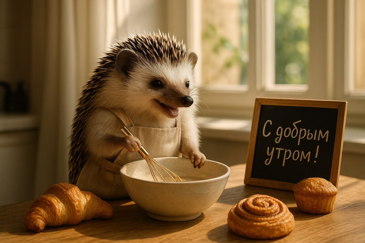 A charming hedgehog wearing a tiny apron, happily mixing ingredients in a bowl on a kitchen table. Sunlight pouring in through a window, with a few baked goods around, and a small chalkboard saying "С добрым утром!" displayed prominently.