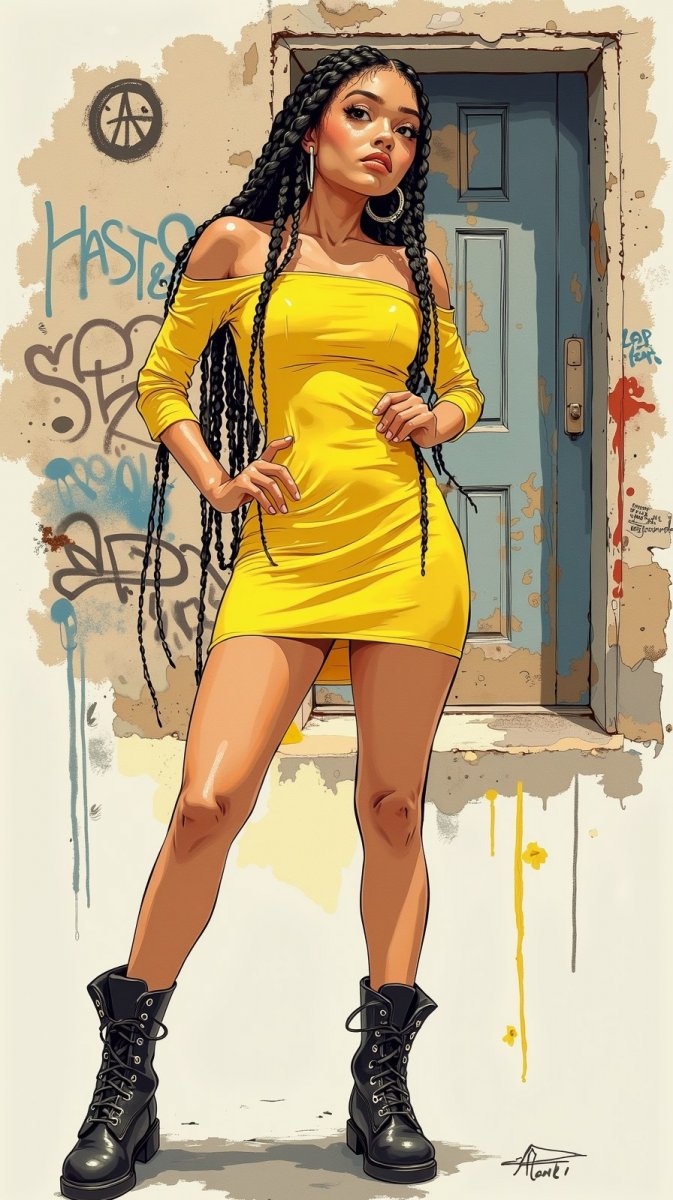 #4. illustration, ink drawing, posing in bright yellow fitted dress with off-shoulder sleeves, paired with black combat boots, long dark hair in braids, casual urban scene backdrop with graffiti #role_fashion_model