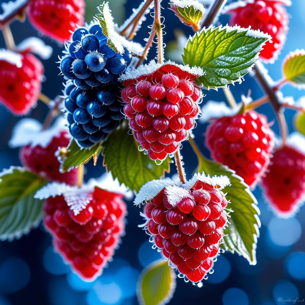 Сапфировые ягоды на ветке малины - зимний мороз - Пример работы нейросети Stable Diffusion