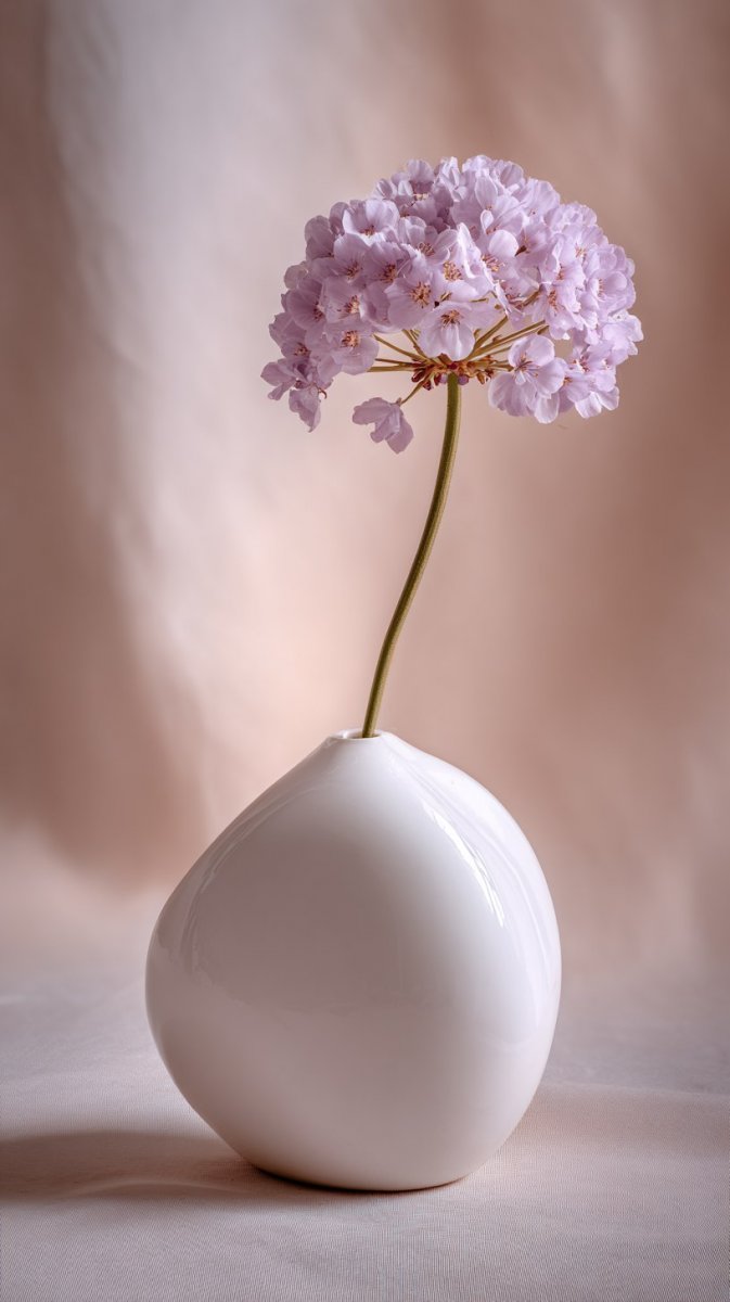 painting of a single flower standing tall in a simple white vase, surrounded by abstract shapes in pastel hues of green and purple, minimalistic style with a soft gradient BG transitioning from peach to cream, creating a serene atmosphere