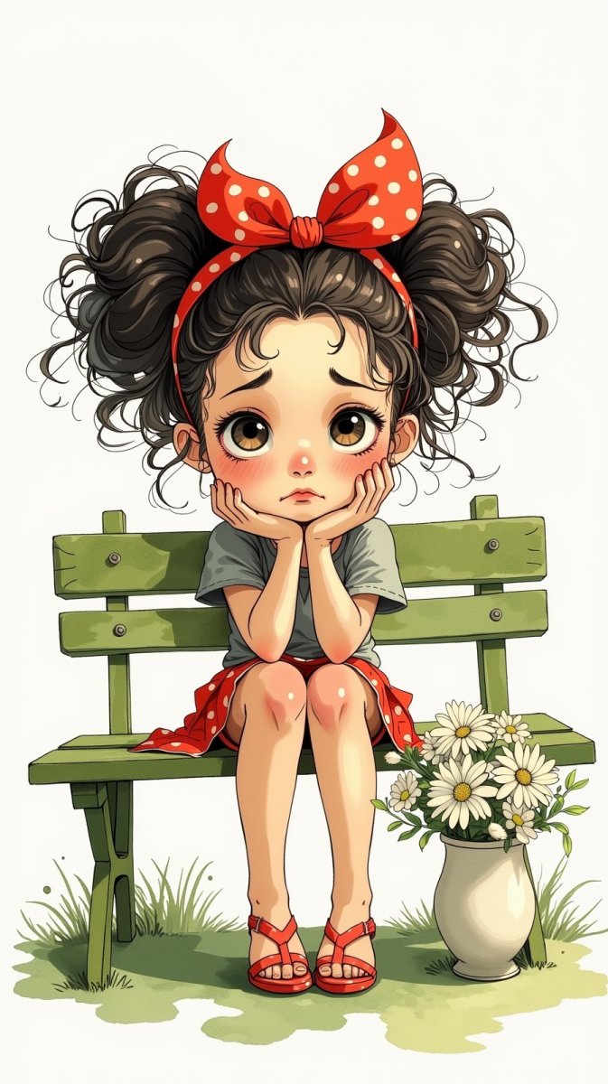 Нежная акварельная иллюстрация запечатлевает момент задумчивости юной девушки. Ее непослушные кудрявые волосы цвета воронова крыла контрастируют с яркой алой лентой, украшающей прическу. Девушка сидит на зеленой скамейке, ее руки покоятся на подбородке, словно она глубоко погружена в мысли. Одетый в простую серую футболку образ излучает некую меланхолию, подчеркнутую грустным выражением лица. Рядом с ней стоит изящный вазон с белоснежными цветами, добавляющий композиции нотку хрупкости и чистоты. Фон выполнен в белом цвете, что позволяет сосредоточить внимание на фигуре девушки и ее эмоциональном состоянии. Эта работа передает атмосферу тихой грусти и мечтательности, оставляя зрителя с ощущением невысказанной истории. Изображение выполнено в технике чернил, что придает ему особую выразительность и глубину. Тонкие линии и деликатные штрихи создают ощущение легкости и воздушности, подчеркивая утонченность образа. Композиция проста, но элегантна, а цветовая гамма сдержанна и гармонична. Это прекрасный пример того, как можно передать сложные эмоции через минималистичный визуальный язык. Иллюстрация идеально подойдет для оформления детских книг или создания нежных открыток. Она пробуждает в душе чувство сопереживания и заставляет задуматься о простых человеческих радостях и печалях