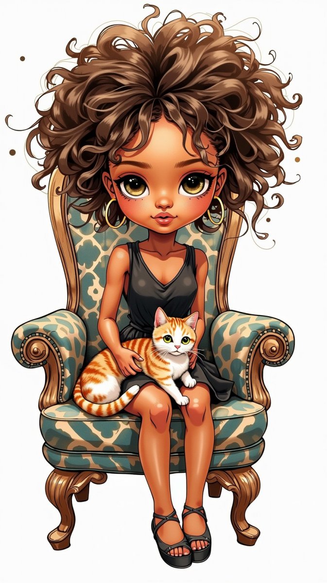 #2. doodling of doll with curly hair wearing black dress and wearing gold hoop earrings, sitting on patterned armchair with a cat, bg is white #role_darling