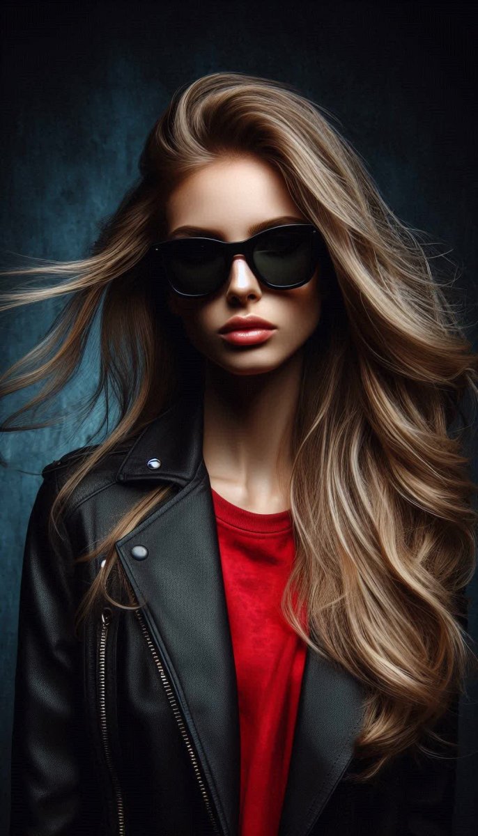 Загадочная красота в стиле гранж. Энергичный портрет молодой женщины, воплощающей бунтарский дух и уверенность в себе. Длинные светлые волосы контрастируют с дерзким сочетанием черной кожаной куртки и яркой красной футболки, а крупные солнцезащитные очки скрывают взгляд, добавляя образу таинственности. Серьезное выражение лица подчеркивает сильный характер и независимость модели. Фон в темно-синих тонах с выраженной текстурой создает атмосферу интриги и глубины, усиливая готический и edgy стиль фотографии. Это не просто портрет – это заявление о свободе самовыражения и непоколебимом характере. Камера запечатлела момент силы и уверенности, создавая визуальный образ современной бунтарки с утонченным вкусом. Изображение излучает энергию музыки и свободы, идеально подходя для обложки альбома или рекламной кампании, ориентированной на аудиторию, ценящую индивидуальность и смелость в стиле. Фотография передает ощущение динамичности и движения, словно модель только что сошла с сцены рок-концерта, оставив после себя шлейф таинственности и харизмы. Это визуальная история о сильной женщине, которая не боится быть собой и выражать свою уникальность через стиль