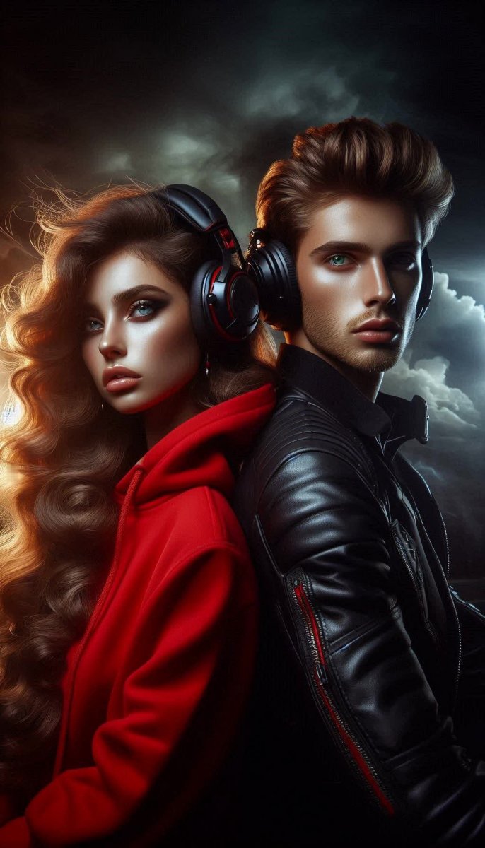 #4. профессиональная фотография моторного дуэта, молодая женщина с длинными кудрявыми волосами, красное худи, черные наушники, молодой человек в кожаной куртке, острая мимика, на заднем плане темное небо с облаками, стиль современный и драматичный #role_music