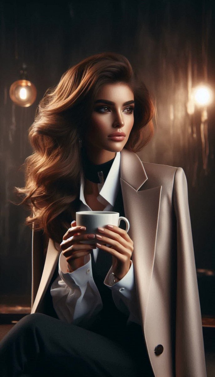 dalle Молодая женщина с кофе: стиль и загадка в кадре. Изображение из нейросети Dalle-3