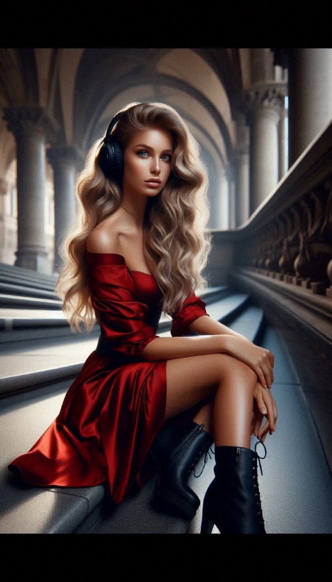 #3. профессиональное фото молодой женщины с длинными светлыми волосами, одетой в красное платье и черные ботинки, сидящей на лестнице с серьезным выражением, наушники на голове, фон – старинное здание с архитектурными деталями #role_music