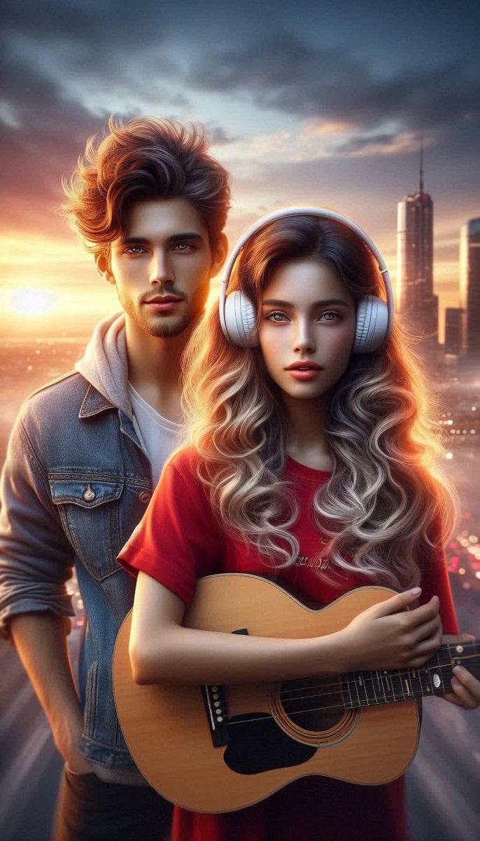 Изящный дуэт на фоне городских красок. Молодой человек и девушка, словно сошедшие со страниц музыкальной сказки, запечатлены в моменте умиротворения и гармонии. Длинные волнистые волосы девушки, обрамляющие ее лицо, создают атмосферу легкой воздушности и свободы. Белые наушники – символ погружения в мир музыки, а яркая красная футболка добавляет образу нотку дерзости и энергии. Маленькая гитара в ее руках словно оживает, обещая волшебные звуки и вдохновляющие мелодии. Закат над городом создает неповторимый фон – палитру теплых оттенков, которые мягко окутывают героев снимка. Этот пейзаж добавляет глубины и смысла композиции, подчеркивая связь между человеком и окружающим миром. Взгляды молодых людей направлены друг на друга с любовью и пониманием, передавая ощущение близости и поддержки. Настроение фотографии пронизано расслабленностью и позитивом – это момент счастья, когда музыка объединяет сердца и дарит незабываемые эмоции. Снимок излучает свет и тепло, вызывая улыбку и желание разделить этот прекрасный момент с близкими. Это история о любви к музыке, дружбе и красоте момента, запечатленная в профессиональном фото, которое наполнит ваш день радостью и вдохновением. Каждая деталь – от прически девушки до закатного неба – создает единую гармоничную картину, которая остается в памяти надолго
